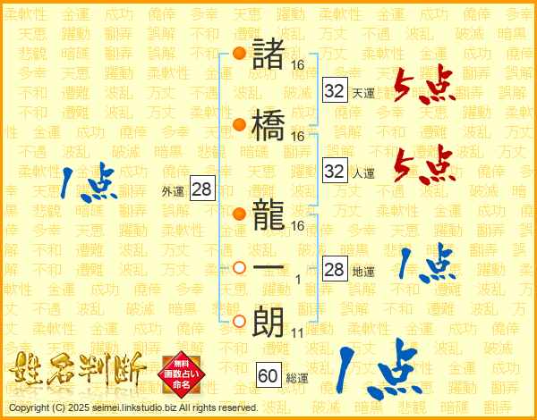 諸(16画)橋(16画) 龍(16画)一(1画)朗(11画)