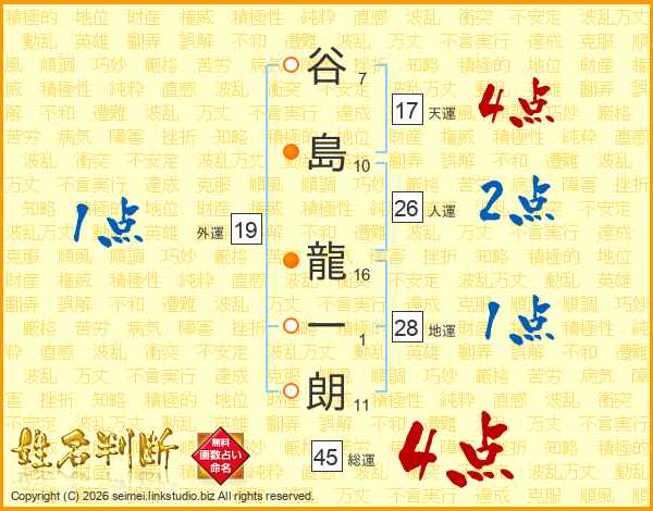 谷(7画)島(10画) 龍(16画)一(1画)朗(11画)