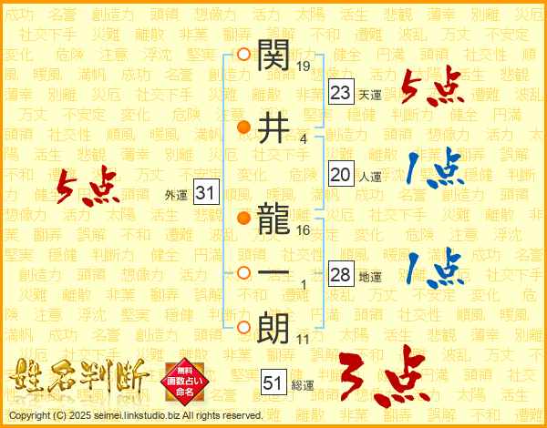 関(19画)井(4画) 龍(16画)一(1画)朗(11画)