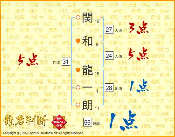 関(19画)和(8画) 龍(16画)一(1画)朗(11画)