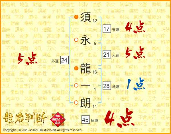 須永龍一朗さんの総運は45画の4点!