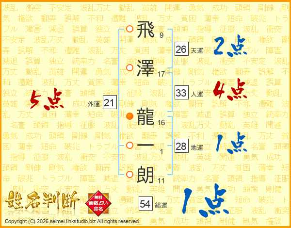 飛(9画)澤(17画) 龍(16画)一(1画)朗(11画)