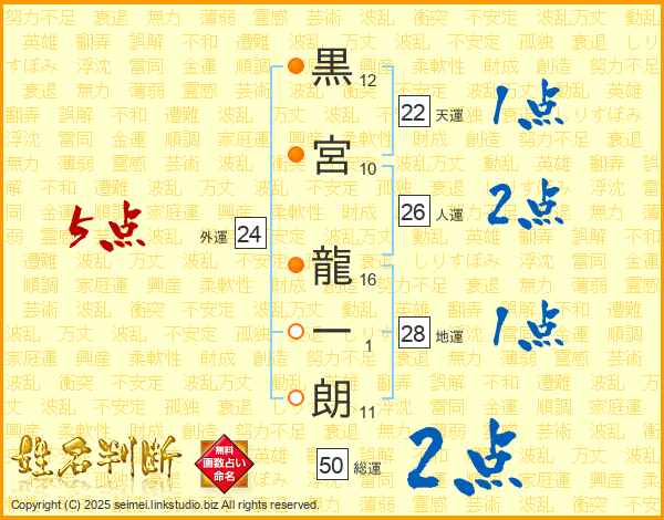 黒(12画)宮(10画) 龍(16画)一(1画)朗(11画)