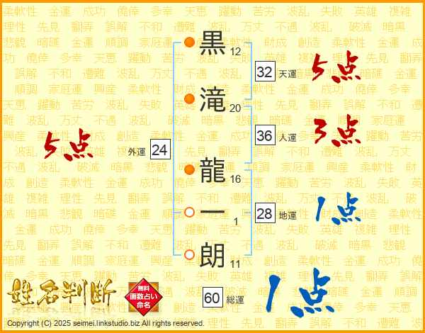 黒(12画)滝(20画) 龍(16画)一(1画)朗(11画)