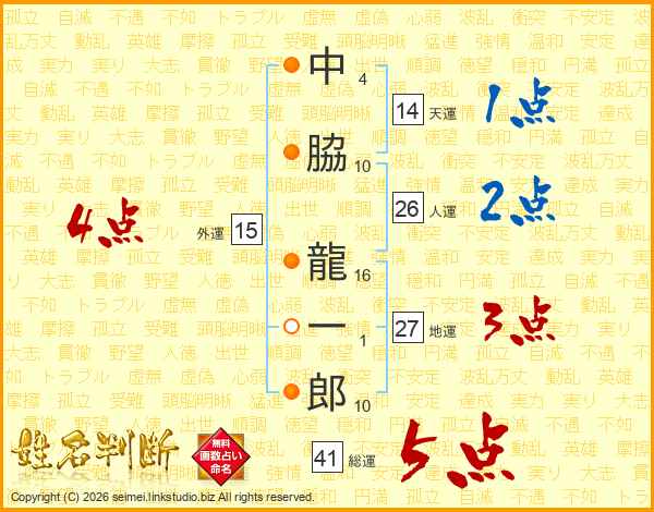 中脇龍一郎さんの総運は41画の5点!