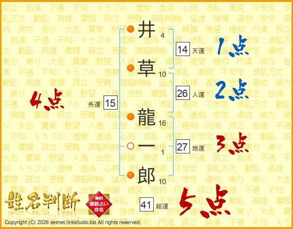 井(4画)草(10画) 龍(16画)一(1画)郎(10画)