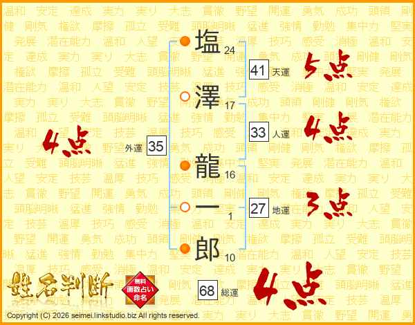 塩(24画)澤(17画) 龍(16画)一(1画)郎(10画)