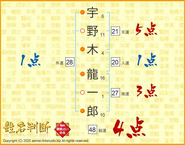宇(6画)野(11画)木(4画) 龍(16画)一(1画)郎(10画)