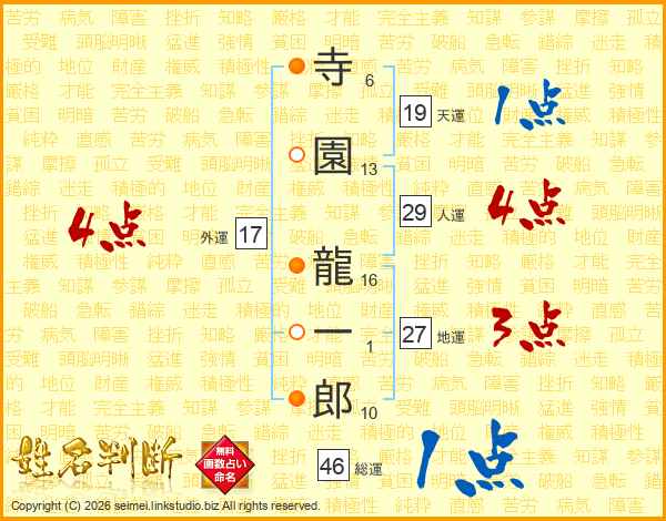 寺(6画)園(13画) 龍(16画)一(1画)郎(10画)