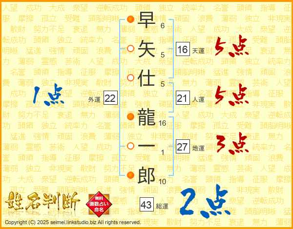 早(6画)矢(5画)仕(5画) 龍(16画)一(1画)郎(10画)