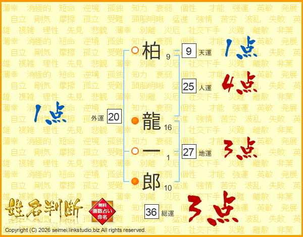 柏(9画) 龍(16画)一(1画)郎(10画)