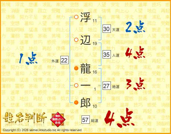 浮(11画)辺(19画) 龍(16画)一(1画)郎(10画)