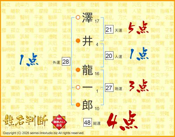 澤(17画)井(4画) 龍(16画)一(1画)郎(10画)