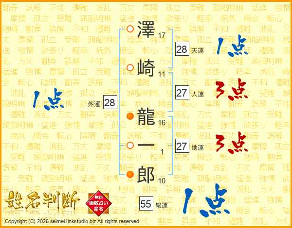 澤(17画)崎(11画) 龍(16画)一(1画)郎(10画)