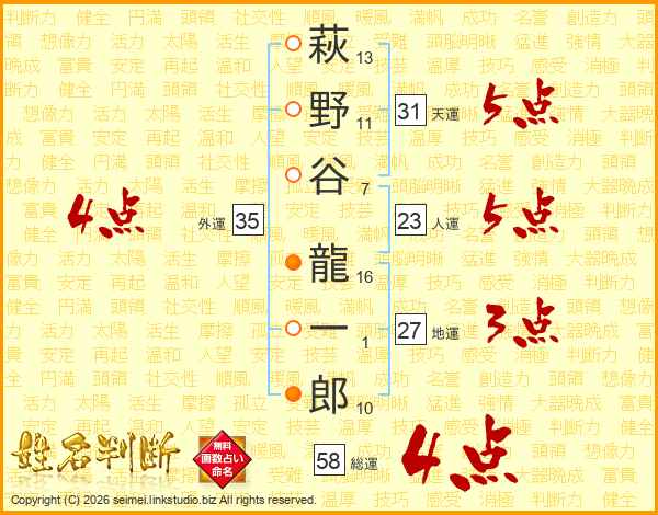 萩(13画)野(11画)谷(7画) 龍(16画)一(1画)郎(10画)