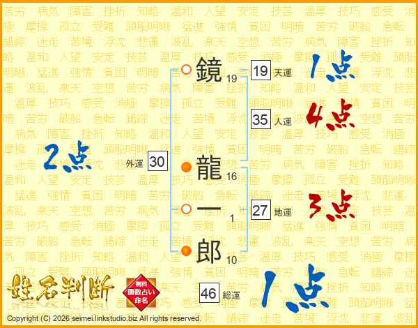 鏡龍一郎さんの人運は35画の4点!