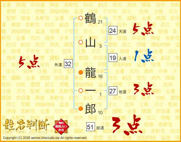 鶴山龍一郎さんの総運は51画の3点!