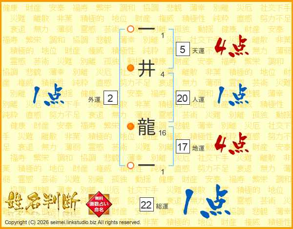 生活面を象徴する運勢です。外部から受ける影響力を表し、結婚運、家庭運や職場、環境への順応性を表します。総運から人運を引いた画数。姓や名が1文字の場合を除く。