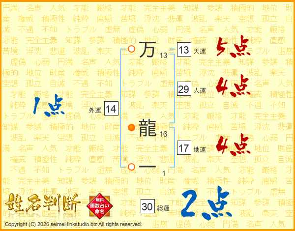 生活面を象徴する運勢です。外部から受ける影響力を表し、結婚運、家庭運や職場、環境への順応性を表します。総運から人運を引いた画数。姓や名が1文字の場合を除く。