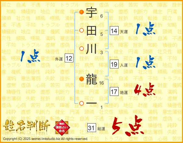 宇(6画)田(5画)川(3画) 龍(16画)一(1画)
