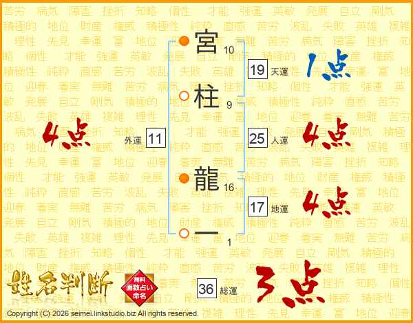 宮柱龍一さんの総運は36画の3点!