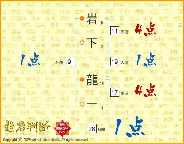 生活面を象徴する運勢です。外部から受ける影響力を表し、結婚運、家庭運や職場、環境への順応性を表します。総運から人運を引いた画数。姓や名が1文字の場合を除く。