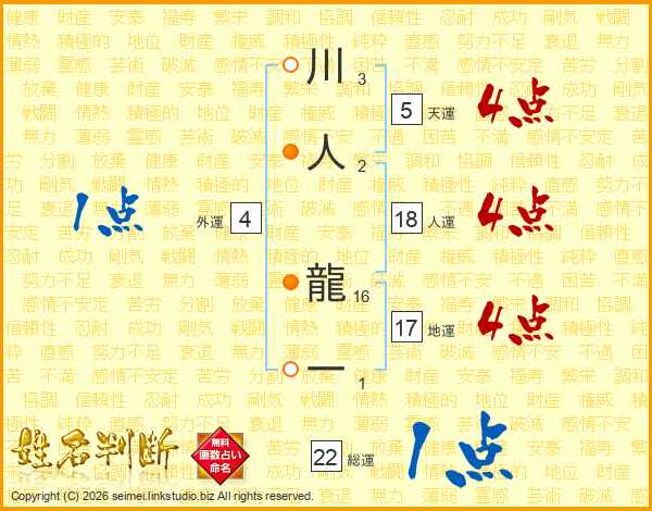 生活面を象徴する運勢です。外部から受ける影響力を表し、結婚運、家庭運や職場、環境への順応性を表します。総運から人運を引いた画数。姓や名が1文字の場合を除く。