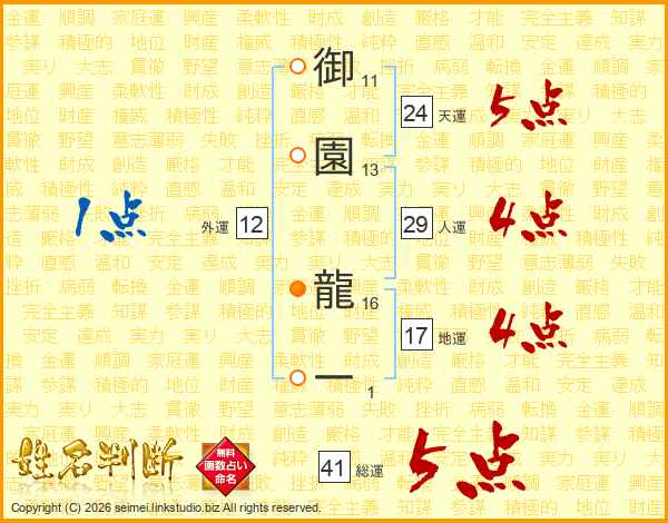 家系が持つ宿命的な運勢を表します。祖先から受け継いだ苗字ですので自分の力が及びません。家柄を象徴します。苗字の合計画数。