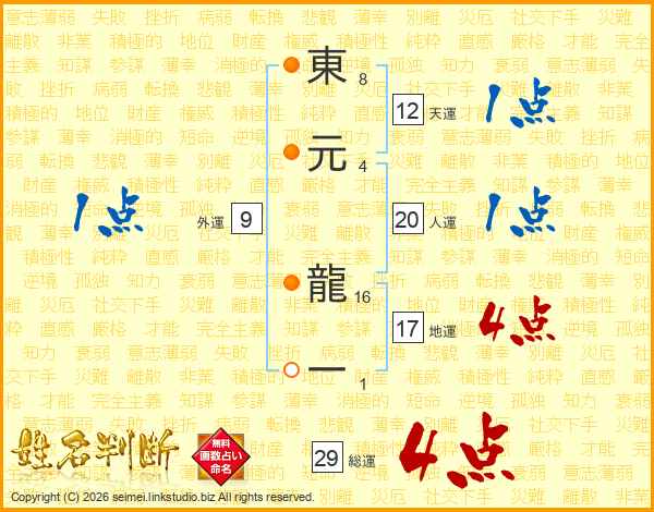 東元龍一さんの総運は29画の4点!