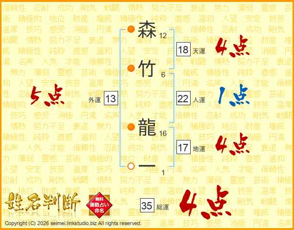 生活面を象徴する運勢です。外部から受ける影響力を表し、結婚運、家庭運や職場、環境への順応性を表します。総運から人運を引いた画数。姓や名が1文字の場合を除く。