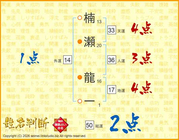 楠(13画)瀬(20画) 龍(16画)一(1画)