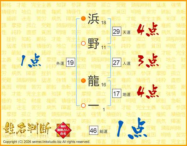 あなたの人生を表す1番重要な運勢です。生涯を通じて影響する総合運となり、主に50歳以降の晩年期に影響を及ぼします。苗字と名前の合計画数。