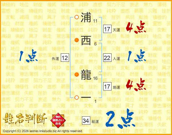 生活面を象徴する運勢です。外部から受ける影響力を表し、結婚運、家庭運や職場、環境への順応性を表します。総運から人運を引いた画数。姓や名が1文字の場合を除く。