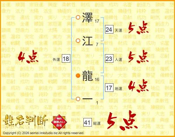 澤(17画)江(7画) 龍(16画)一(1画)