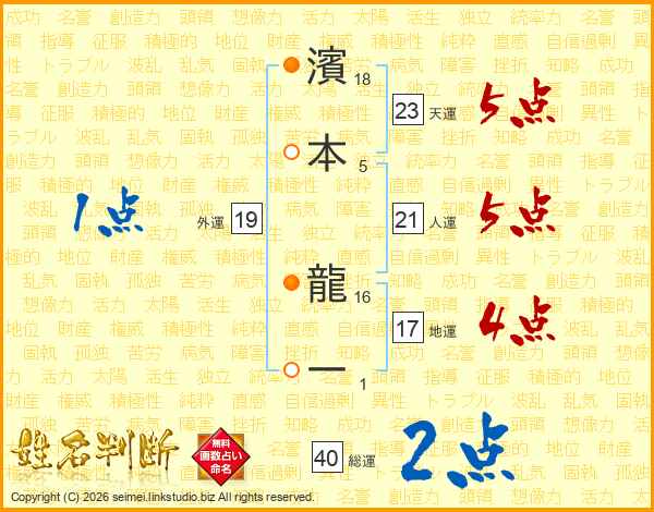 あなたの人生を表す1番重要な運勢です。生涯を通じて影響する総合運となり、主に50歳以降の晩年期に影響を及ぼします。苗字と名前の合計画数。