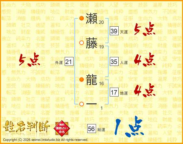 瀬(20画)藤(19画) 龍(16画)一(1画)