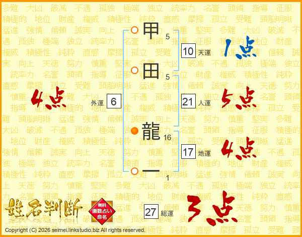 生活面を象徴する運勢です。外部から受ける影響力を表し、結婚運、家庭運や職場、環境への順応性を表します。総運から人運を引いた画数。姓や名が1文字の場合を除く。