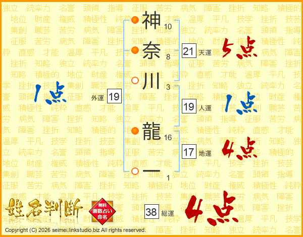 神奈川龍一さんの総運は38画の4点!