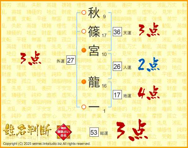 秋(9画)篠(17画)宮(10画) 龍(16画)一(1画)