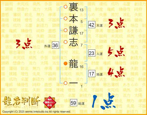 裏本謙志龍一さんの総運は59画の1点!