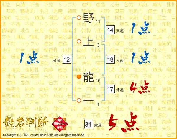 生活面を象徴する運勢です。外部から受ける影響力を表し、結婚運、家庭運や職場、環境への順応性を表します。総運から人運を引いた画数。姓や名が1文字の場合を除く。