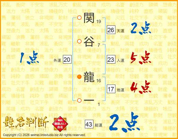 関谷龍一さんの天運は26画の2点!