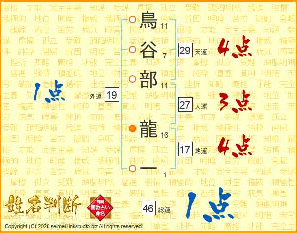 鳥(11画)谷(7画)部(11画) 龍(16画)一(1画)