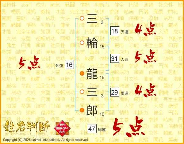 三(3画)輪(15画) 龍(16画)三(3画)郎(10画)