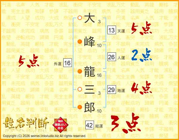 大(3画)峰(10画) 龍(16画)三(3画)郎(10画)
