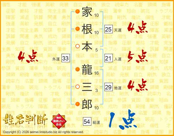 家(10画)根(10画)本(5画) 龍(16画)三(3画)郎(10画)