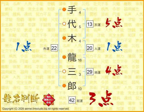 手(4画)代(5画)木(4画) 龍(16画)三(3画)郎(10画)