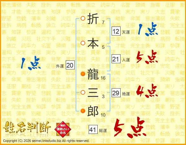 折(7画)本(5画) 龍(16画)三(3画)郎(10画)