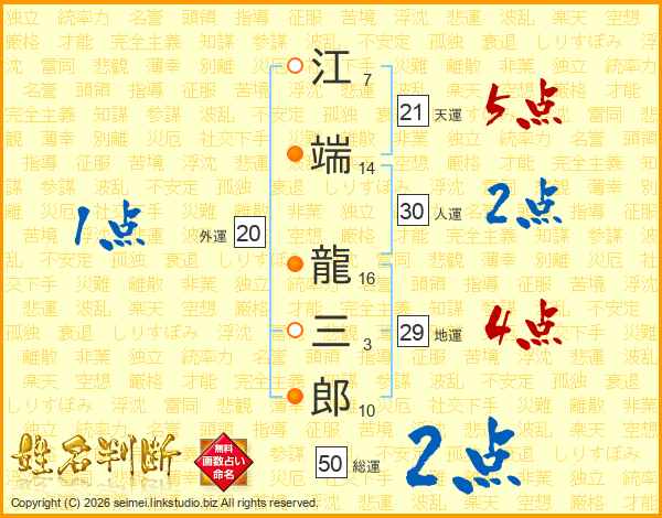 江(7画)端(14画) 龍(16画)三(3画)郎(10画)