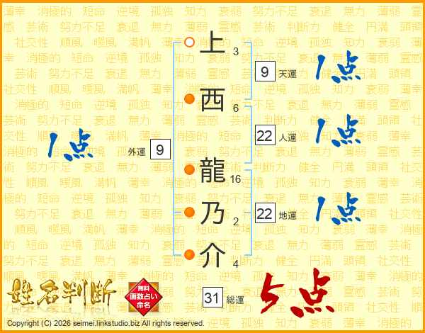 上西龍乃介さんの総運は31画の5点!
